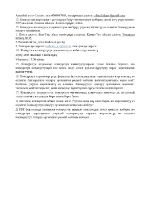 Документтер 2025-жылдын 21-июль күнүнүн саат 17:00гө чейин Беш-Таш айыл өкмөтүнүн имаратында кабыл алынат.