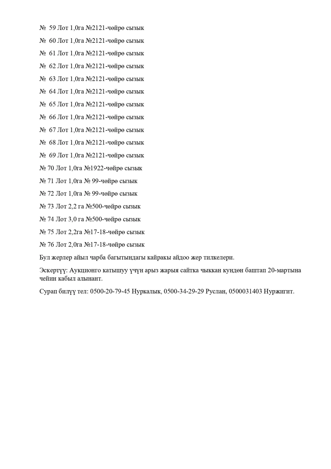 Беш-Таш айыл өкмөтүнө караштуу Кайра бөлүштүрү фондунун жеринен ижарага берүү үчүн 2025-жылы 24-мартында саат 10:00 аукцион өткөрүлөт.