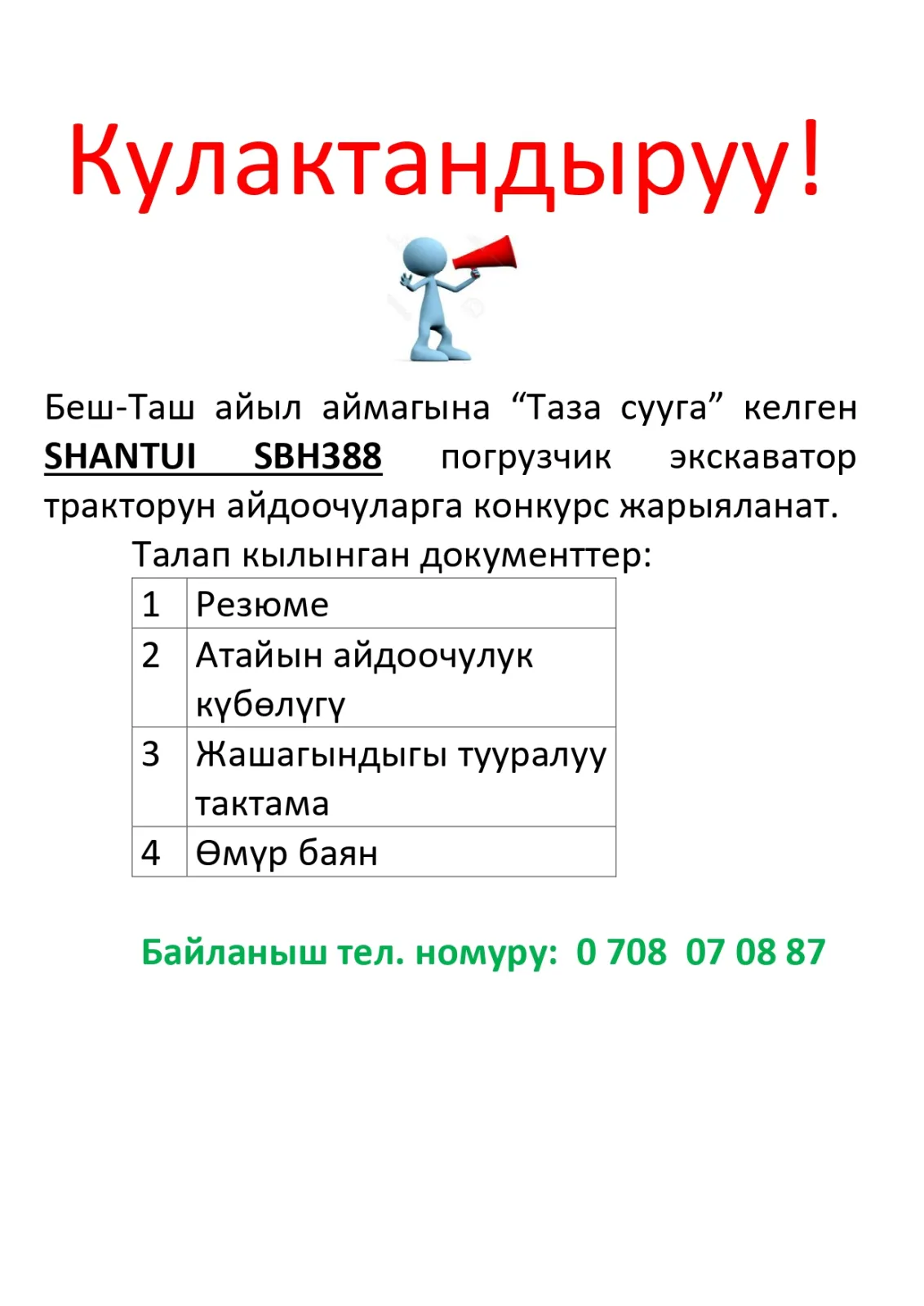 Беш-Таш айыл аймагына “Таза сууга” келген SHANTUI SBH388 погрузчик экскаватор тракторун айдоочуларга конкурс жарыяланат.